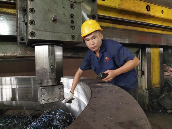 他為人憨厚老實(shí),吃苦耐勞,服從安排,任勞任怨,做事專注細(xì)致,被張主任看在眼里記在心里。因此當(dāng)8米立車一名師傅辭職后,他便按照“量才配崗”的原則,立即把趙江調(diào)到立車崗位,每天親自教他操作立車。通過他的嚴(yán)格要求,加上趙江堅(jiān)持不懈的努力,他終于熟練掌握了立車的操作技術(shù)。如今,他在立車崗位上己經(jīng)做了兩年,前后己帶了兩位徒弟。每當(dāng)同事夸他上手快時(shí),他卻覺得自己的技術(shù)離師傅還有很大差距?!凹埳蠈W(xué)來終覺淺,絕知此事要躬行。張主任的親自教導(dǎo)、我從書本上自學(xué)來的知識(shí),自己按條條框框操作,這是打基礎(chǔ)。領(lǐng)悟了圖紙的加工要求后,在保證質(zhì)量的前提下,編寫好程序、各項(xiàng)參數(shù)、速度(包括進(jìn)給速度和轉(zhuǎn)速)后,我還必須隨時(shí)觀察車床上的一舉一動(dòng),監(jiān)管加工全過程,在工作實(shí)踐中不斷發(fā)現(xiàn)問題、思考問題、解決問題、總結(jié)經(jīng)驗(yàn)。當(dāng)我能對具體問題具體分析具體解決并游刃有余時(shí),我就從操作工變成師傅了,”趙江說。